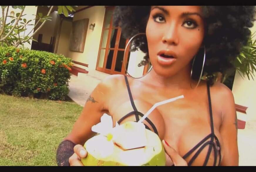 I sported a cute little afro style today while hanging out on the grass with this big juicy coconut. I sip the milk through my luscious, ebony lips, as I play with myself through those silky black panties. How do you like me in these spiked heel, vinyl boots, with the sexy black fishnets gripping my inner thighs. Watch me put that flower in my hot backdoor p***y, and give you close-up view as it peeks out of my cute Asian ass!