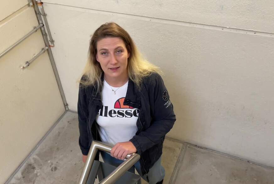 WOW - was für ein geiler F**k. Ich stelle mich billig nur mit einem knappen Minirock ohne Slip, Netzstrumpfhose, High Heels, nem knappen Top und knallroten Lippen ins Treppenhaus vom Parkhaus. Hin und wieder kommt einer vorbei. Ich spreche einen Typen an und kriege ihn rum. Ich pose für ihn und zeige alles von mir. Sein S*****z steht sofort. Ich b**se ihm geil seinen h**ten F********l und bitte ihn, mich zu f****n. Ich ziehe meinen Minirock hoch und er knallt mich blank im stehen d***y an der Wand. Oh das fühlt sich so geil an! Ich lege mich oben vor die Treppen auf den Boden und er f***t mich einfach public im Parkhaus weg, während ich auf dem schmutzigen Boden liege. So krass... es könnte theoretisch jeden Moment jemand durchs Treppe...